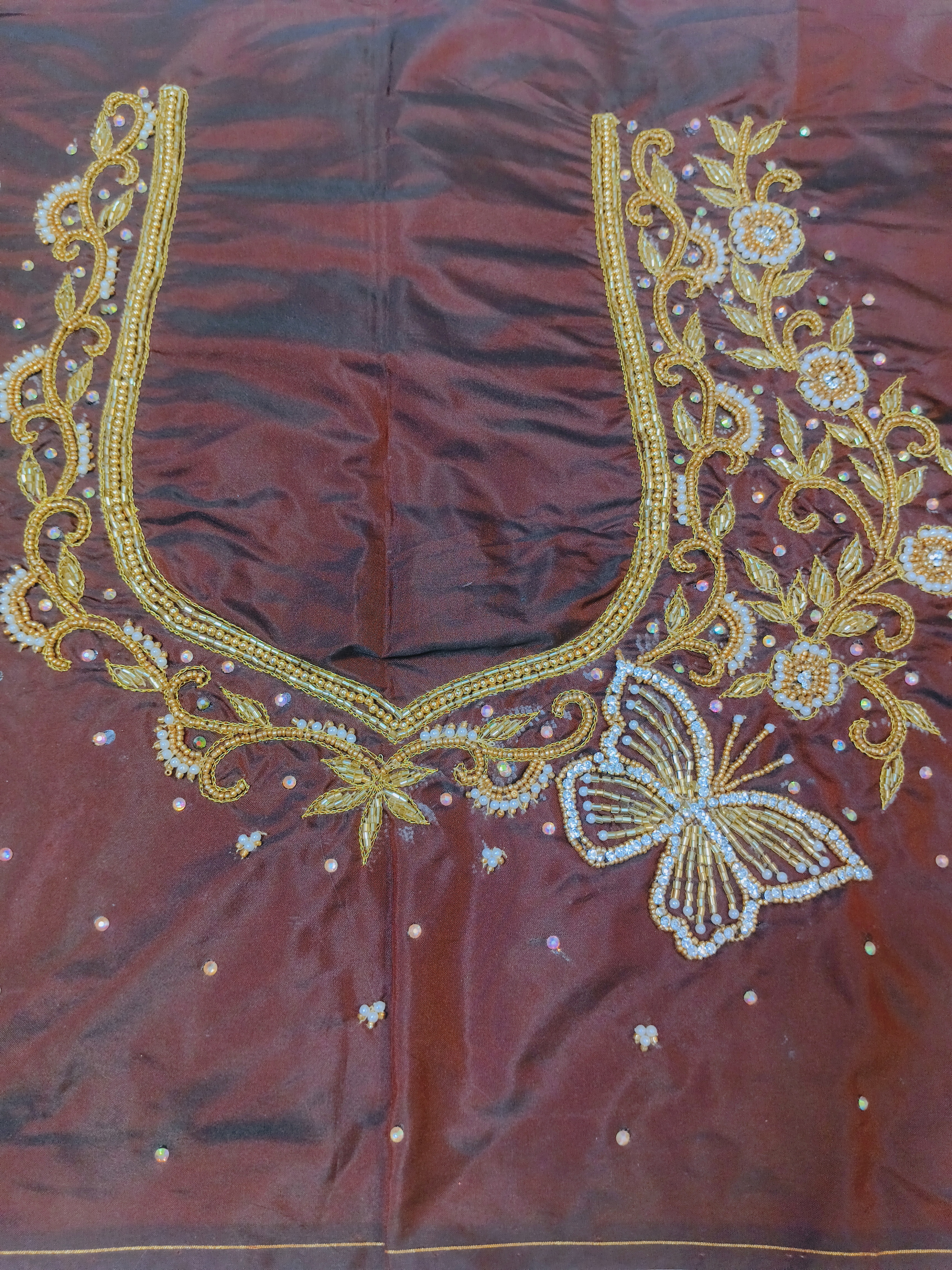 Rich chocolate brown blouse piece featuring heavy maggam embroidery with a standout butterfly design.
