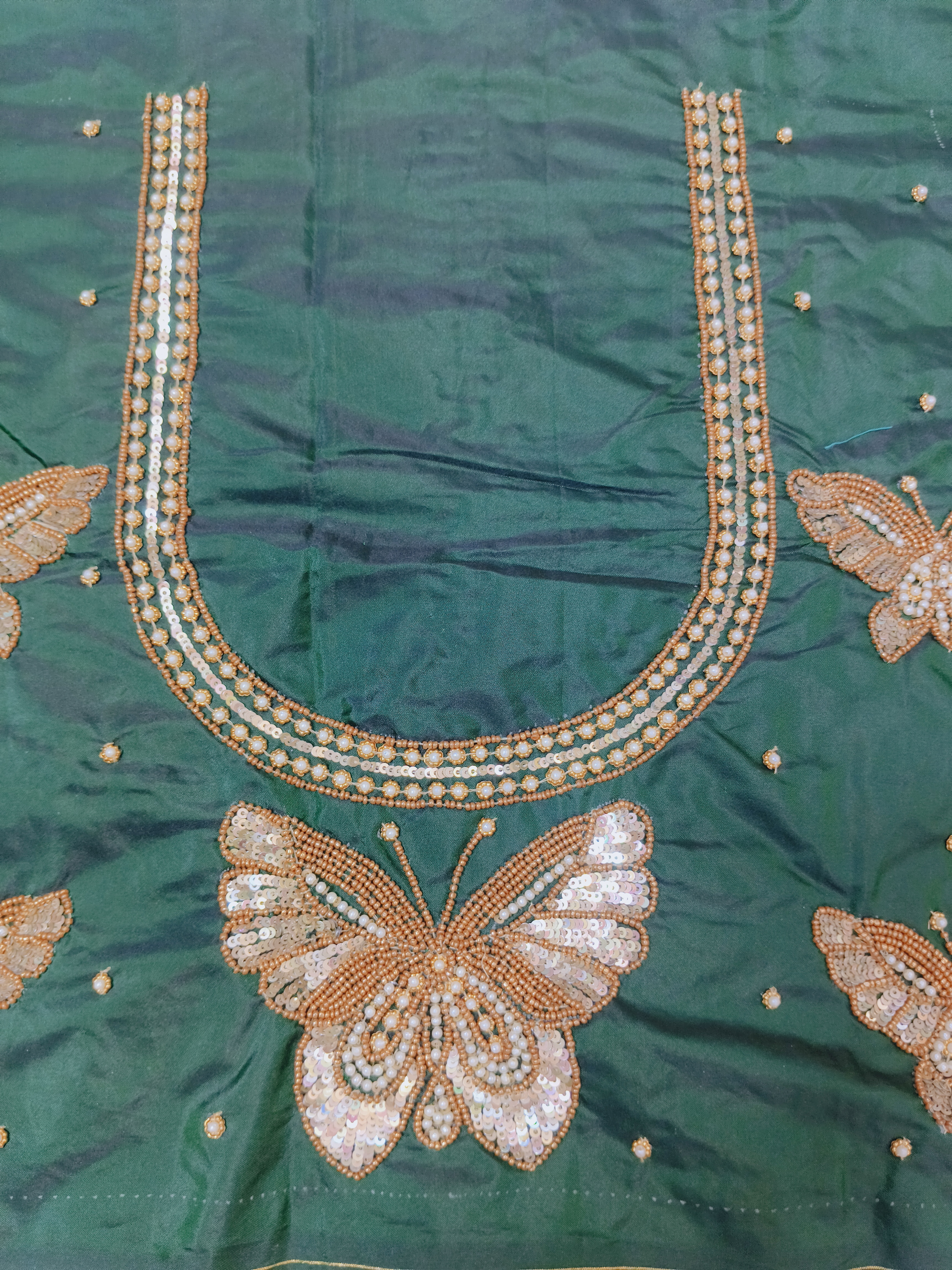 Elegant dark green blouse piece featuring a bold butterfly maggam embroidery design.
