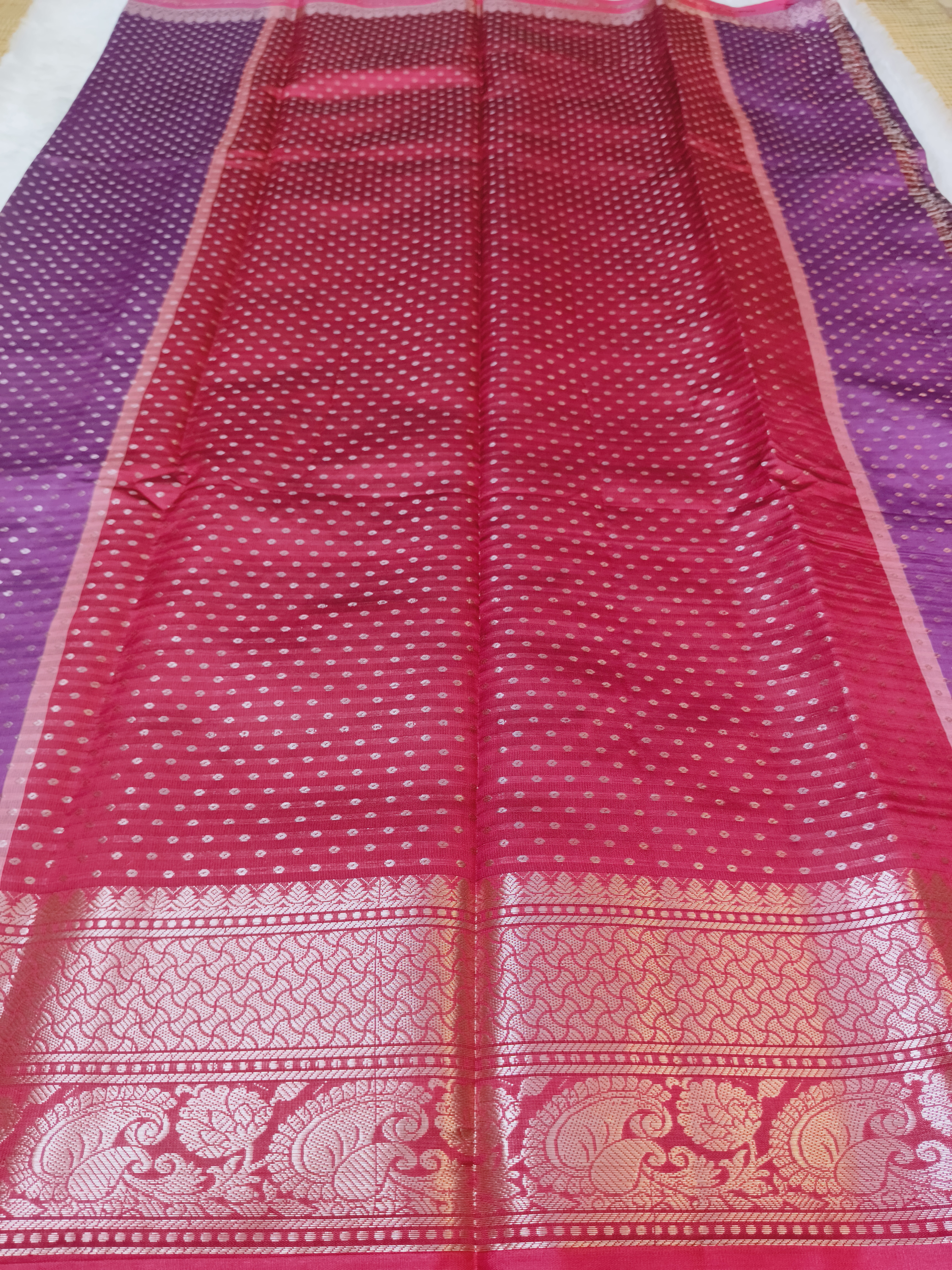 A striking magenta Banaras saree detailed with fine gold zari buttas across the body and a heavily woven traditional border. The small dotted motifs create balance, while the intricate paisley and geometric zari work along the border adds depth and richness. The contrast pink edging enhances the overall vibrance. Perfect for weddings, festive evenings, and special occasions where you want a bold yet classic statement.