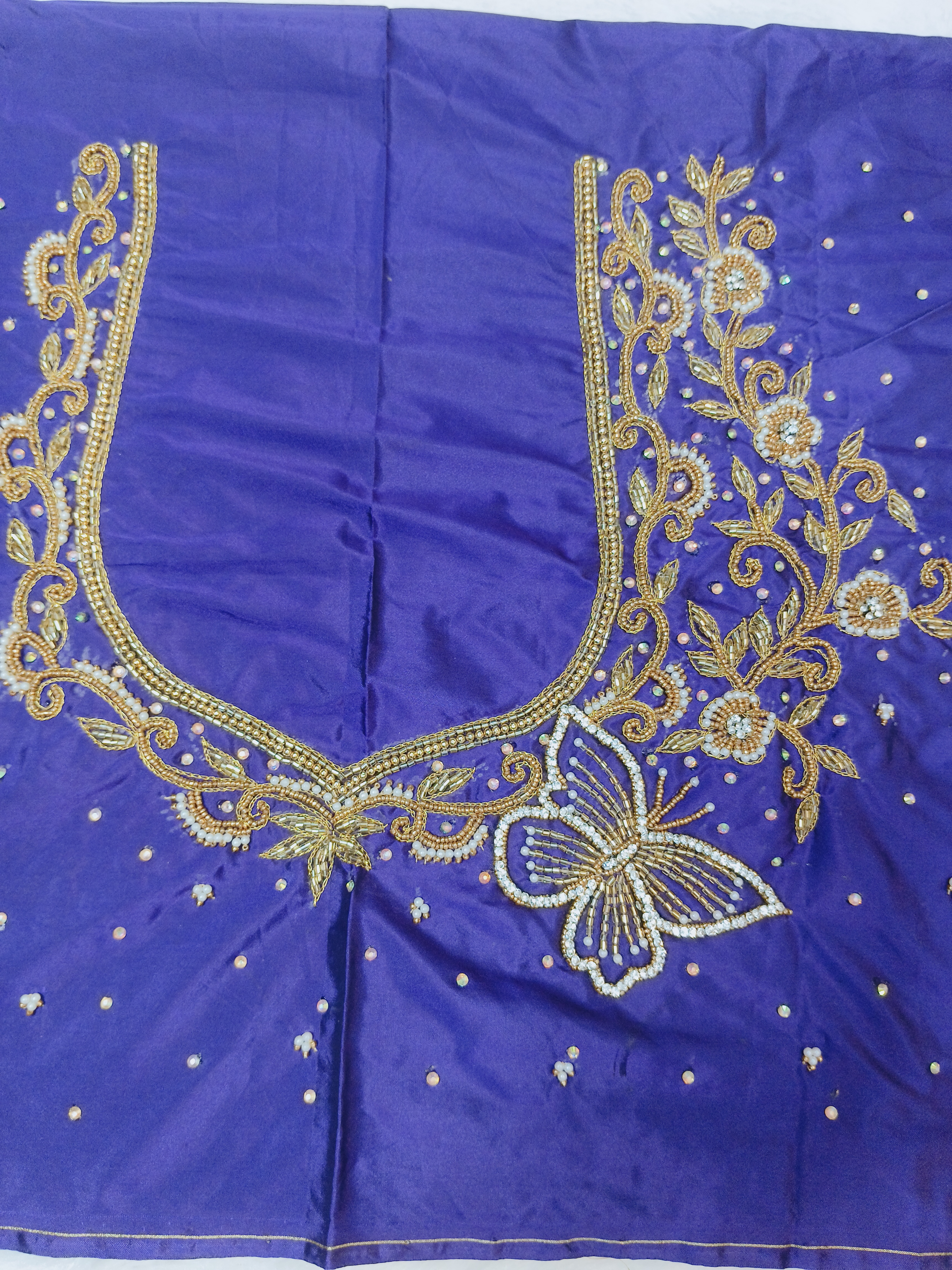 Royal purple blouse piece with heavy butterfly maggam embroidery and stone detailing.