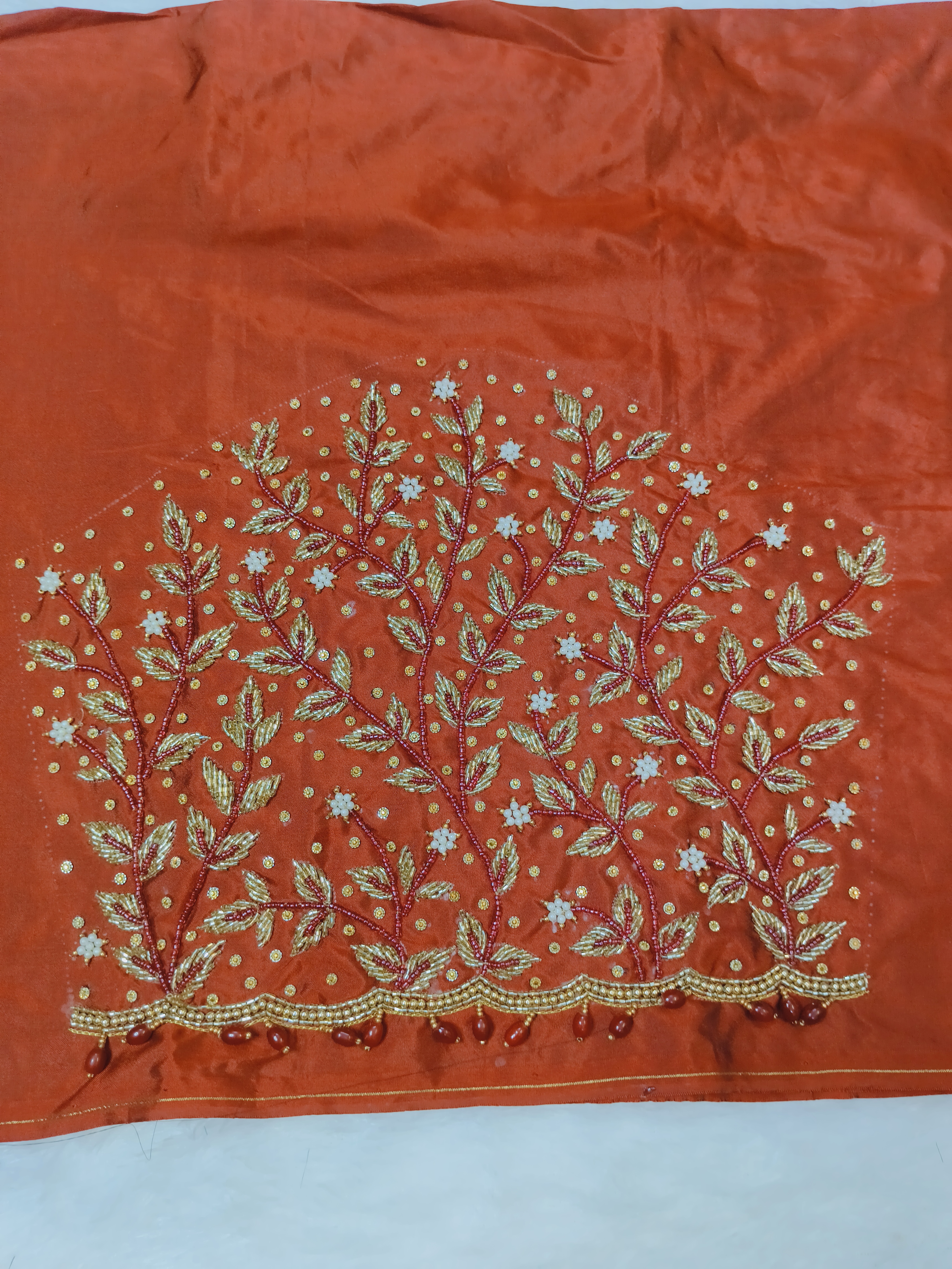 Rich red blouse piece with heavy all-over maggam embroidery.