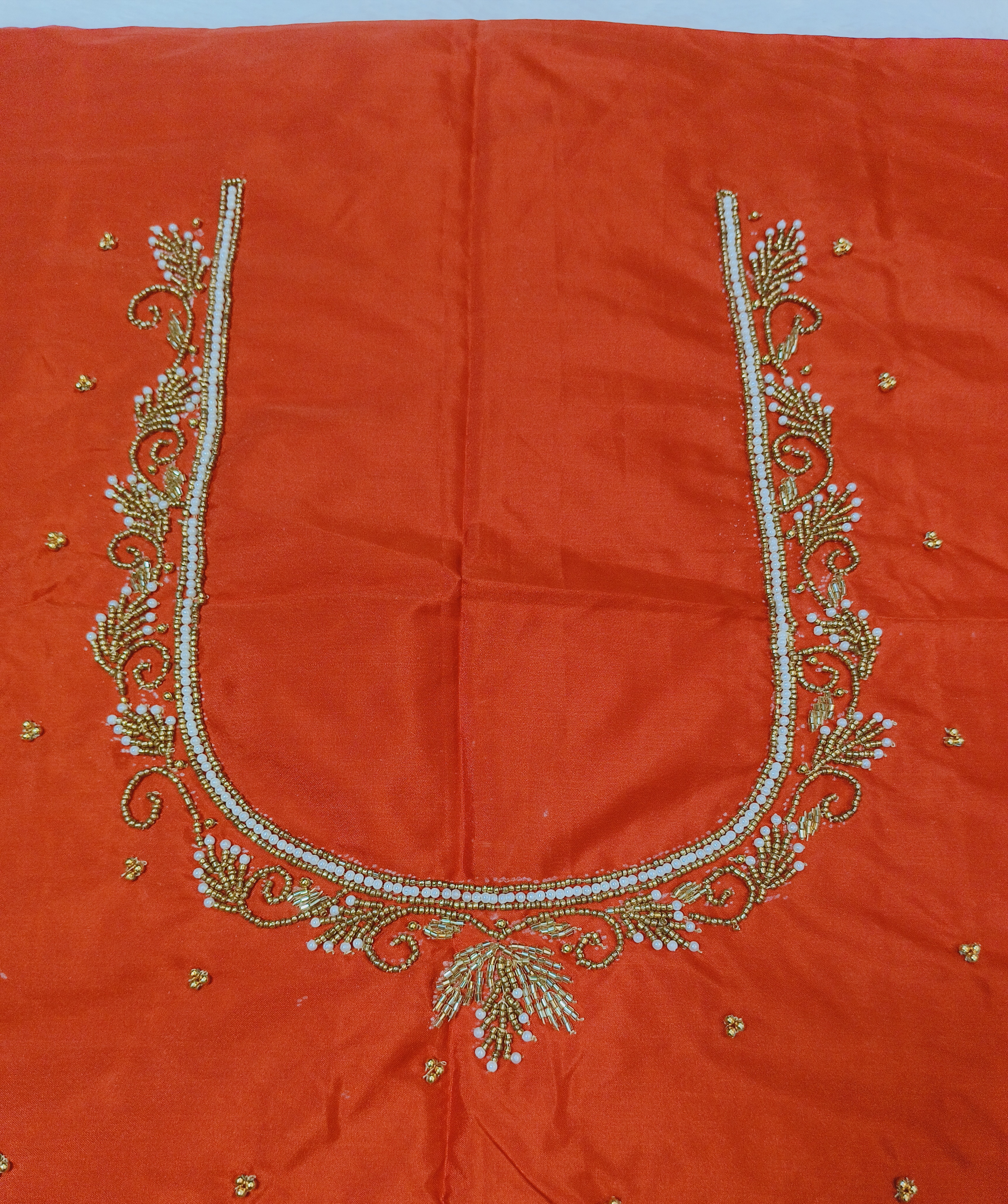 Vibrant red blouse piece featuring elegant teega (branch) maggam embroidery.