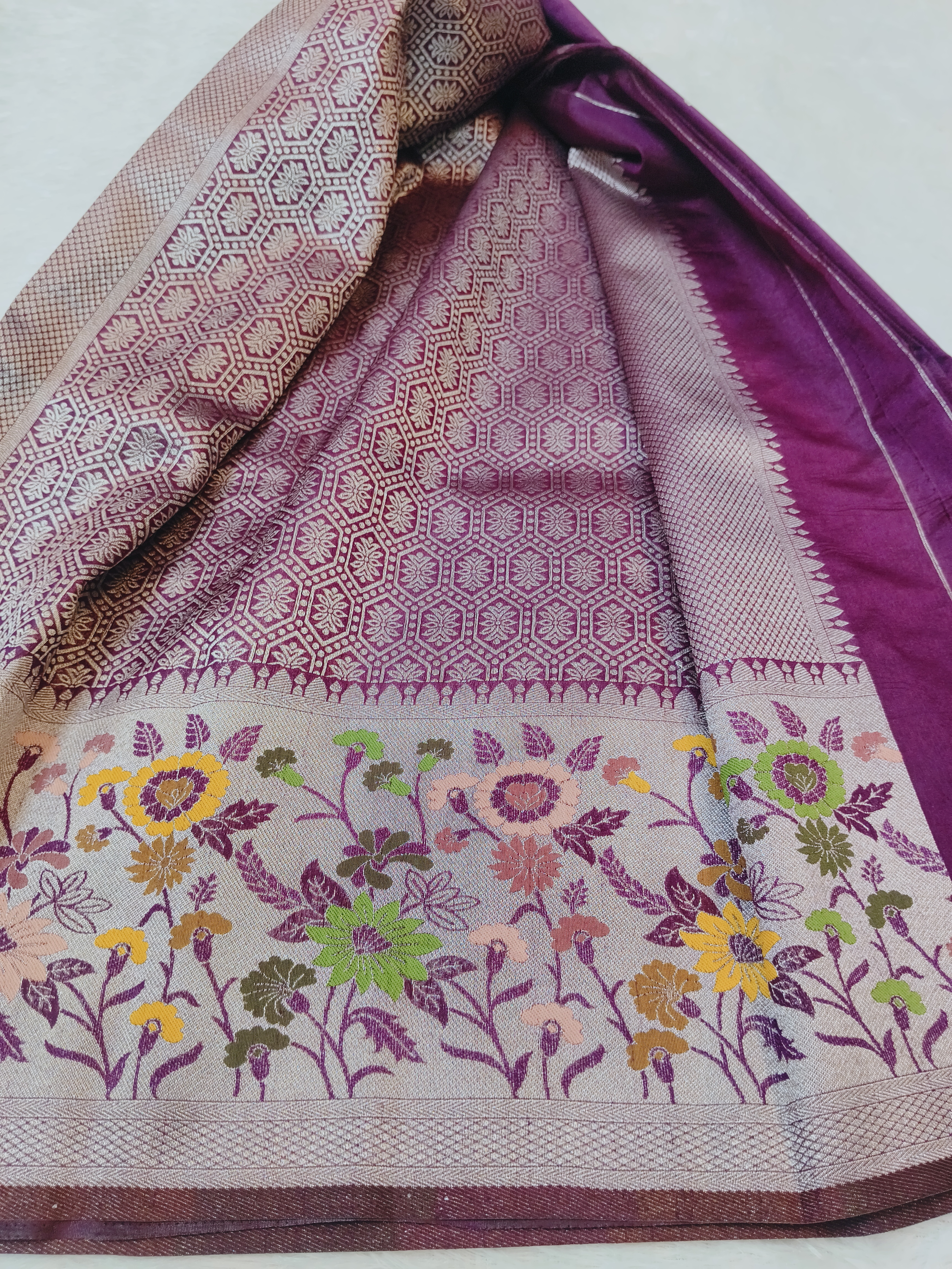Weave: Traditional Banarasi Weave with Multicolor Floral Brocade Border