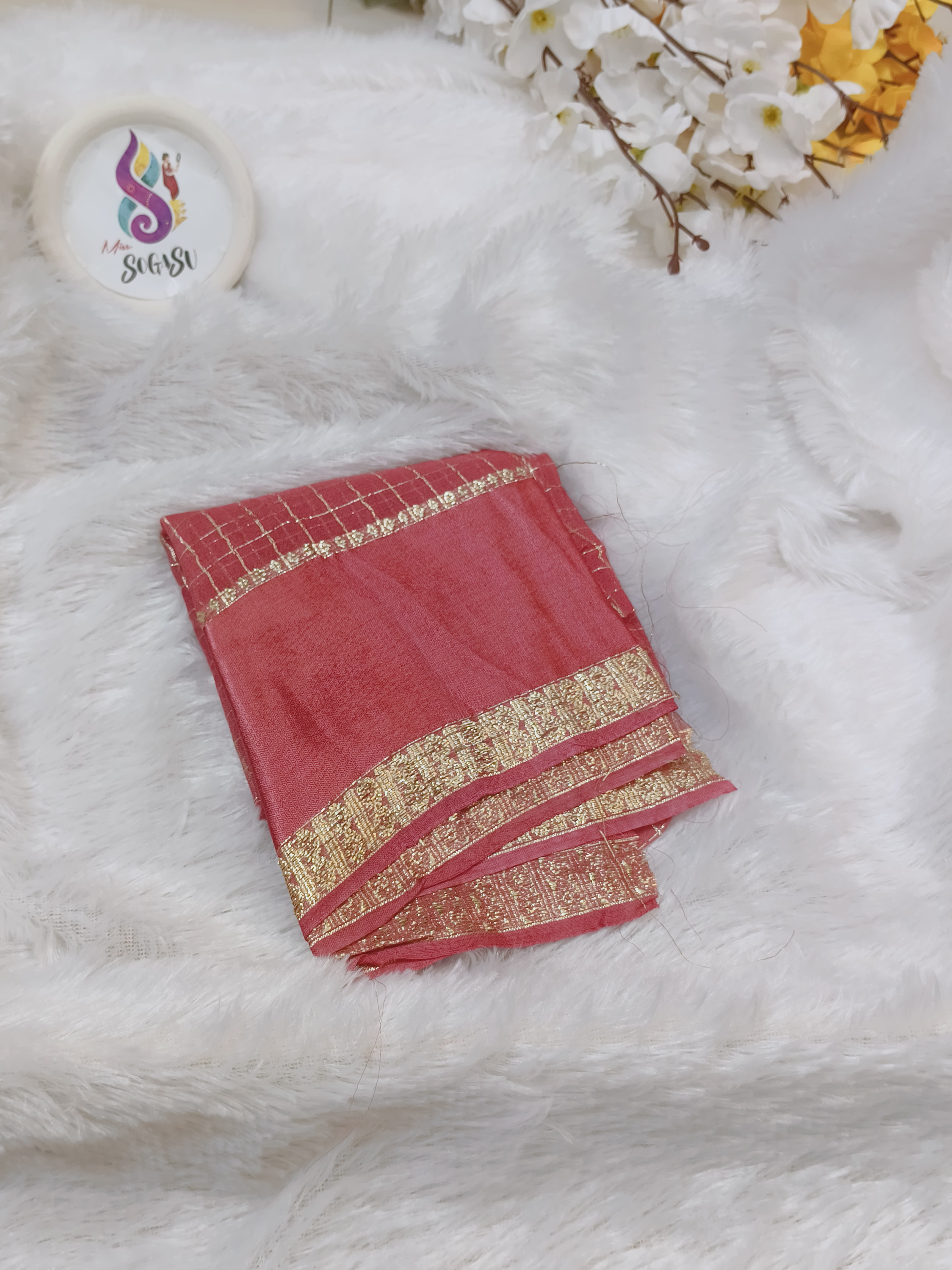 This pink chinon georgette saree features a delicate gold check pattern across the body, giving it a neat and refined look. The plain lower panel adds a subtle contrast, while the rich woven gold border enhances the overall elegance.