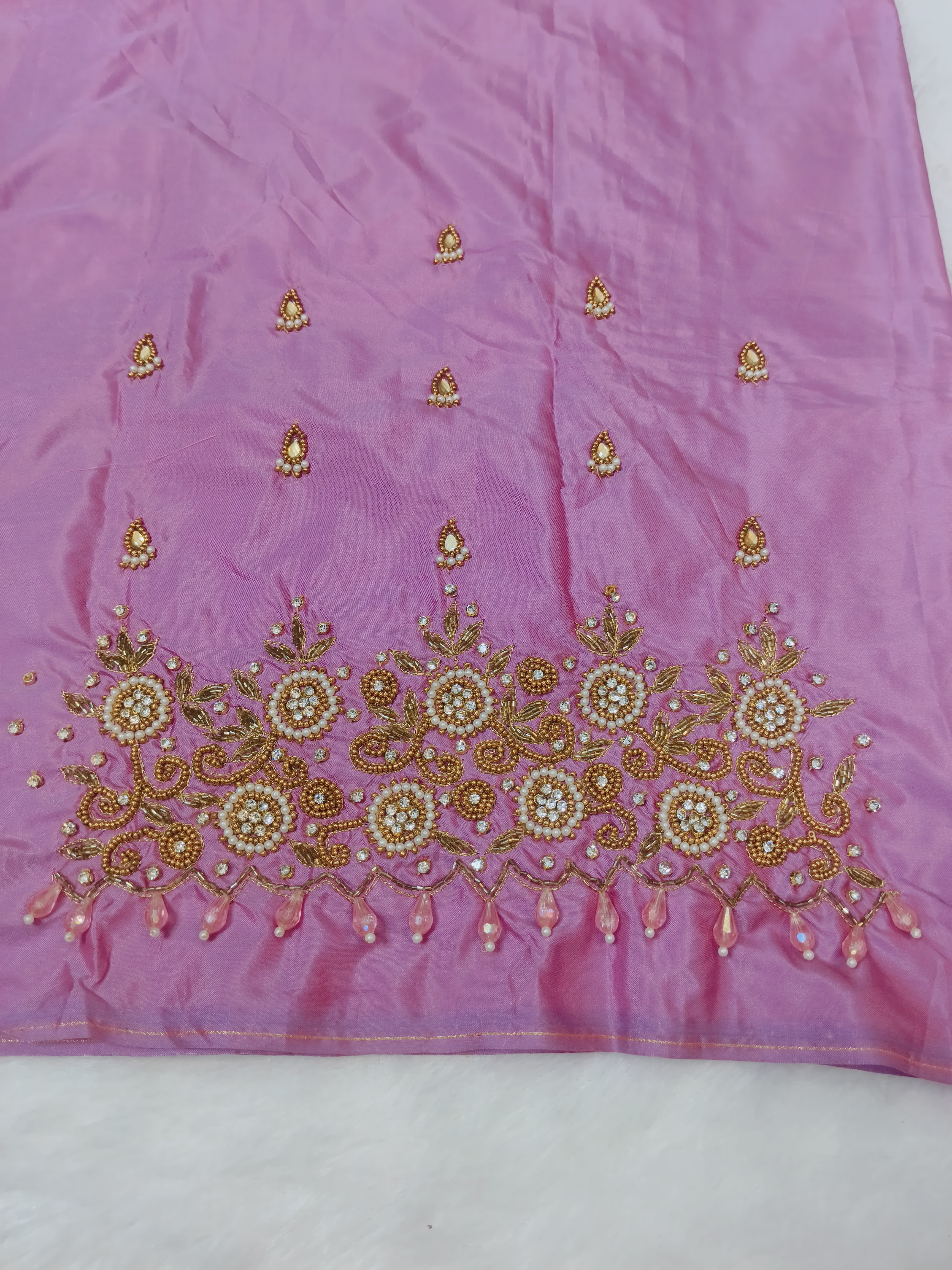Elegant pink blouse piece featuring rich heavy maggam embroidery with intricate floral patterns and pearl detailing. Finished with delicate bead hangings for a premium festive look. Perfect for weddings, functions, and traditional wear styling.