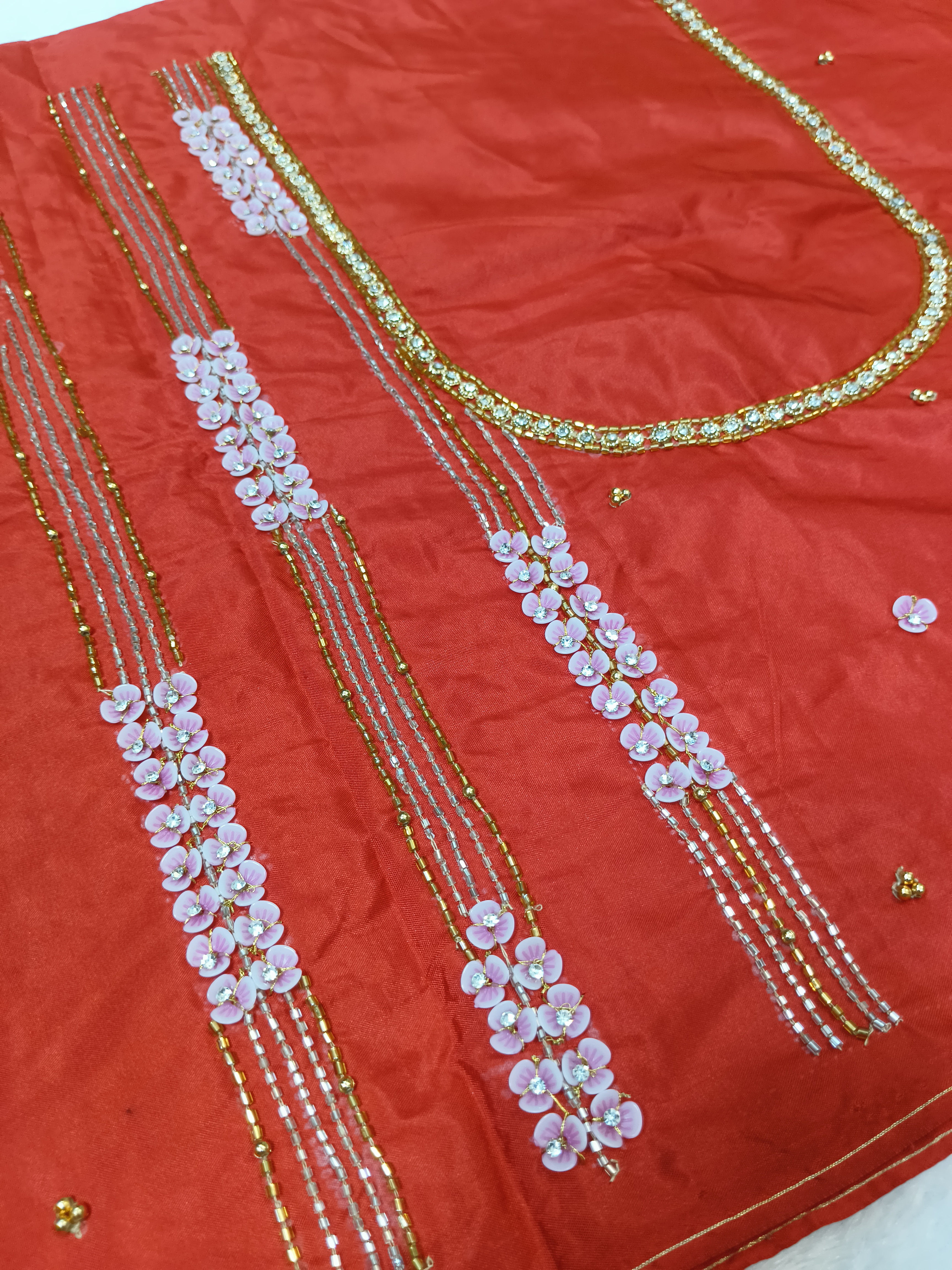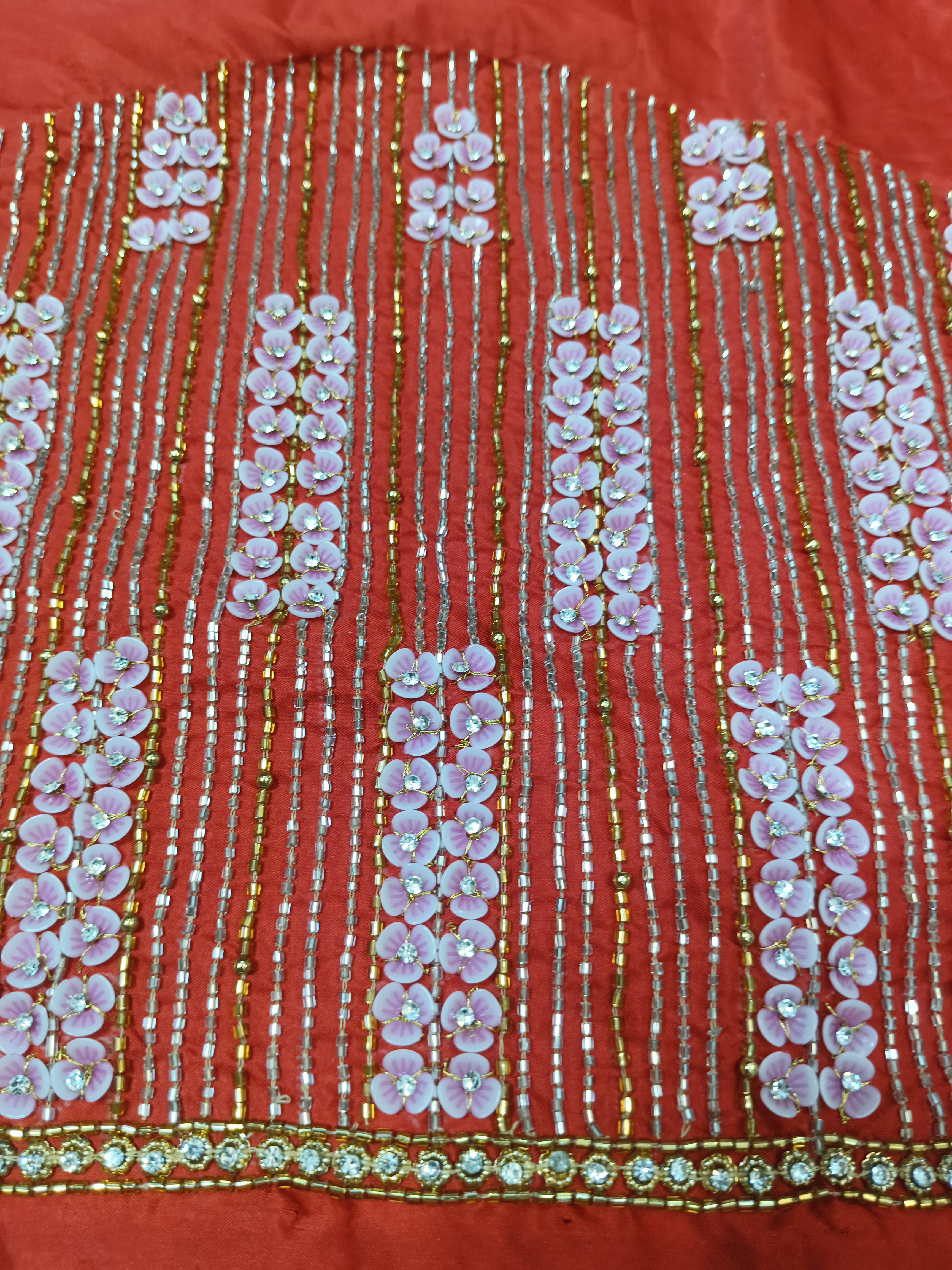 Bright red blouse piece featuring heavy all-over rose design with intricate bead and thread work. Vertical floral pattern gives a rich and unique look, finished with a neat designer border. Perfect for festive wear, weddings, and standout traditional styling.